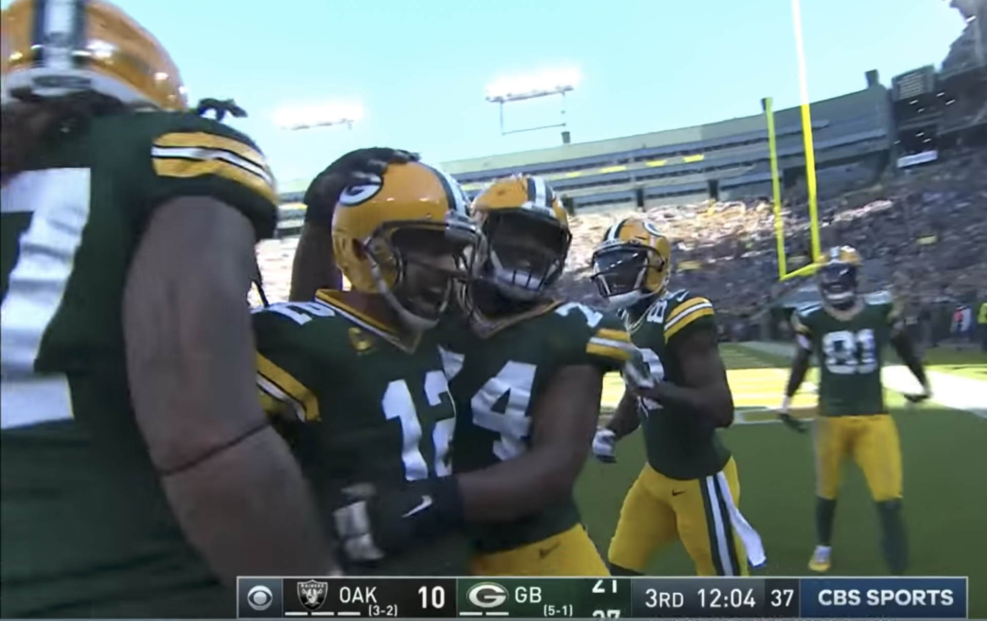 Today, “the bad man” Aaron Rodgers became the first player in “modern” NFL history, to throw for 5 Touchdowns, rush for 1 Touchdown, and compile a perfect 158.3 passer rating. Please keep in mind: He was playing the Raiders without his top wide receiver, Davante Adams!