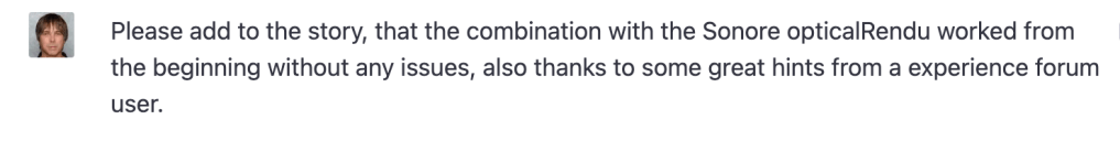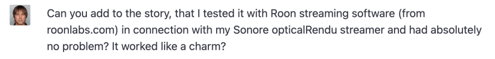 When it finally arrived, Alex connected the new DAC to his HiFi system and paired it with his Sonore opticalRendu streamer and Roon streaming software.