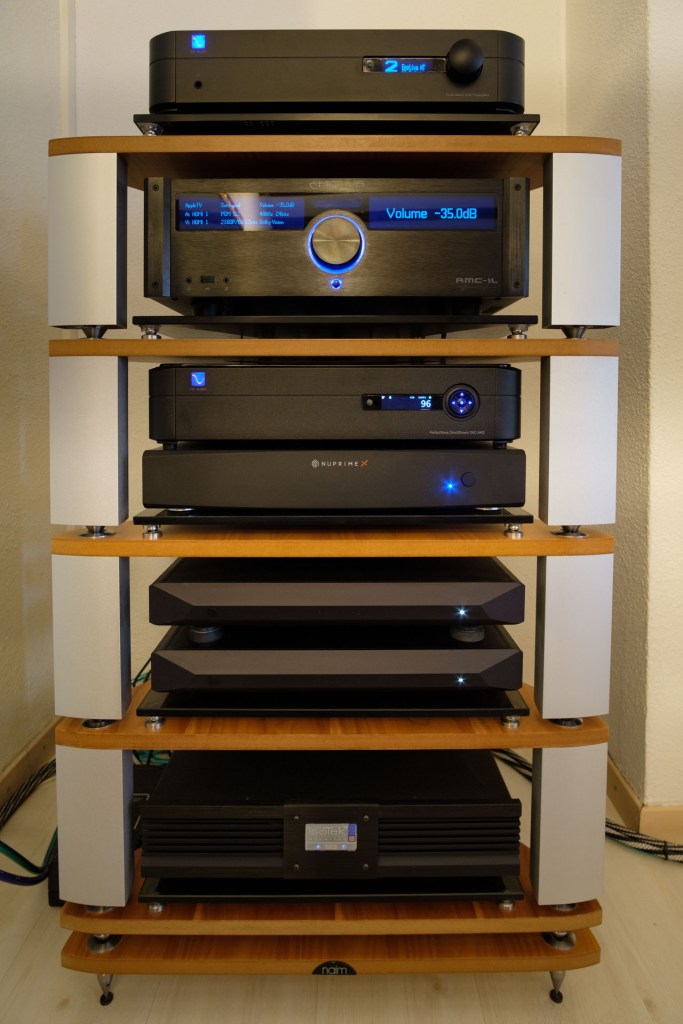Now, in order to enjoy home theater properly, I needed a multi-channel amplifier to drive the corresponding center and surround speakers (also Piega Coax). What could be more obvious than to rely on the proven NuPrime brand here as well? There I switched from the MCH-K38 to the MCX-4. Basically a generation change from the same manufacturer. 🙂