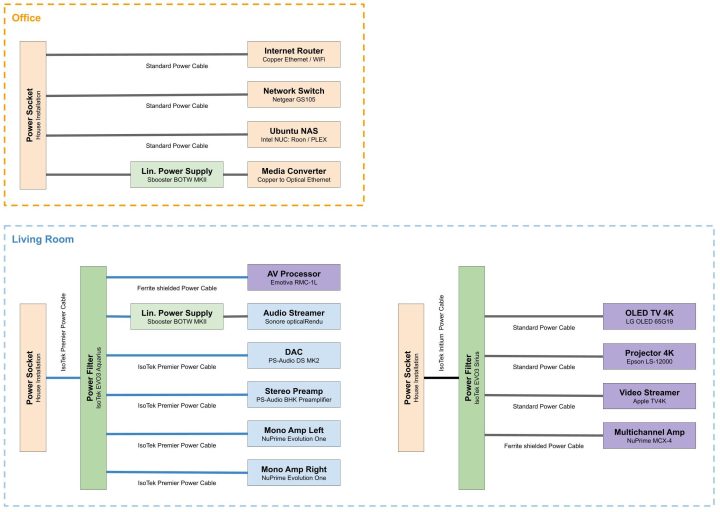 As you can see, with the exception of the components in the office, the energy supply has a high priority for me. OK, there is the linear power supply for the media converter, which in this constellation (in my opinio) is just a waste of money. The stereo elements (including the AV processor) are connected to an IsoTek EVO3 Aquarius, while the video components are plugged into an IsoTek EVO3 Sirius power rail. For the power cables, I put a high weight especially on the stereo components. The rest I see as less important.