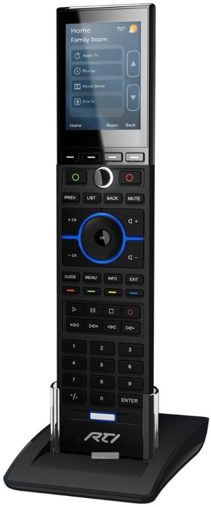 In the end, my only choices left were Control4, Crestron, or RTI. The latter convinced me of the physical design and arrangement of the buttons. My reasons for the RTI T2x: A full complement of hard buttons provide quick, intuitive control, while the 2.8″ touchscreen interface can be custom tailored for full control of devices throughout the environment.