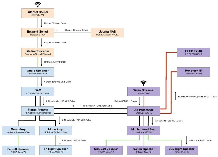 The purple bricks are for home theater use. The Home Theater bypass mode of the stereo preamplifier allows the AV processor to use the stereo front speakers. All components are connected with balanced XLR cables from inakustik.