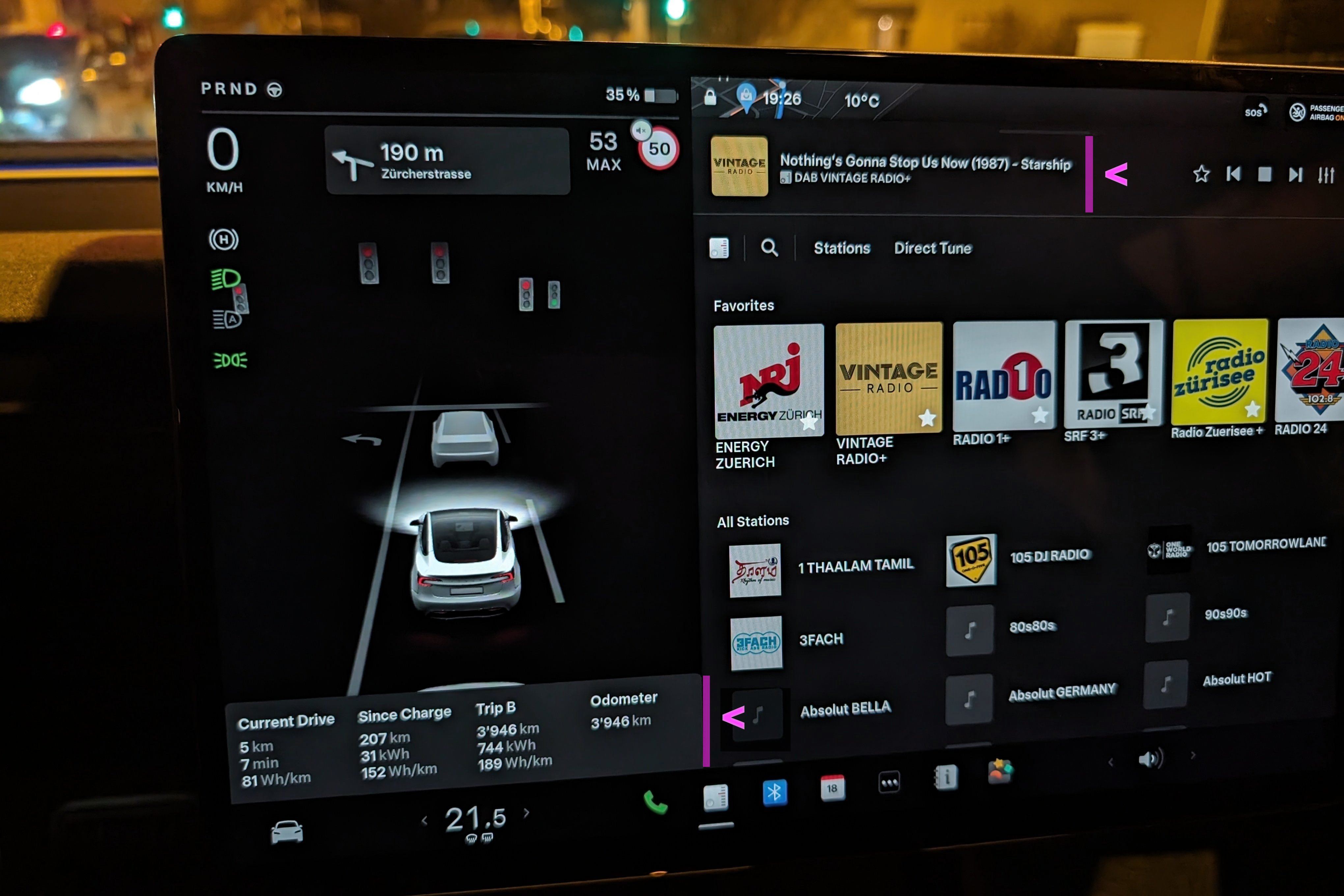 Unlike spezialized music services that meticulously curate music selections based on genres, locations, and user preferences, Tesla’s interface for radio is rudimentary, grouping everything under a generic “Favorites” section. The favorite stations are listed on a narrow band in one line and you have to laboriously swipe to the left if you have saved more than 6 stations. It’s clearly lacking any semblance of organization or cohesion. A meaningful browsing function is completely missing, there is only a global search which implies that you know the name of a specific channel. Instead, all receivable stations are listed alphabetically. There is no option to hide individual radio stations. For example, I am not interested in the Tamil radio station on top of the list.