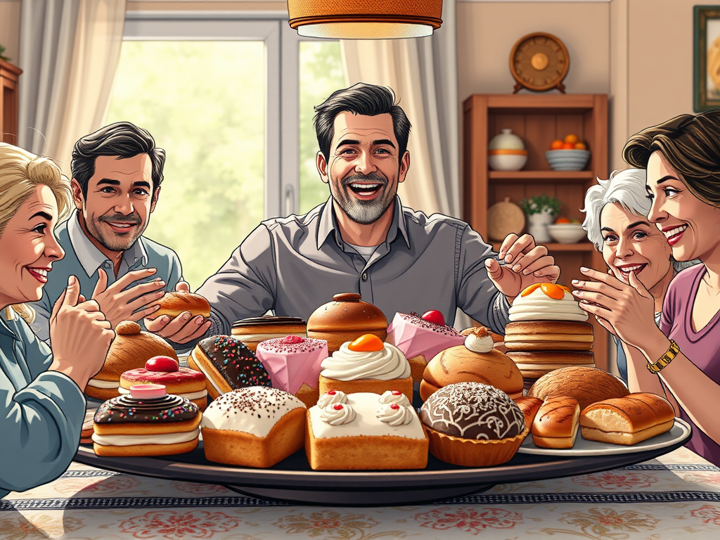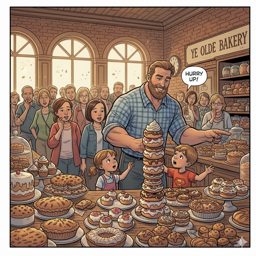 And if this weren’t enough, there is the Family Edition™ of the bakery consultation, where Dad decides he must prove his weekend usefulness in front of his offspring and the general public. This is Dad in “weekend hero” mode who barges in with the whole circus: kids, backpack, stroller, dog…. A full expedition team. A shop meant for six people suddenly hosts a family reunion. The children spread through the shop like a swarm, poking the glass, jamming their fingerprints everywhere, shouting “Papa, was ist DAS?!” and pointing at everything like it’s a zoo. And then Dad begins his own personal consultation. Slow, proud, thorough — as if he’s selecting jewelry rather than carbohydrates.